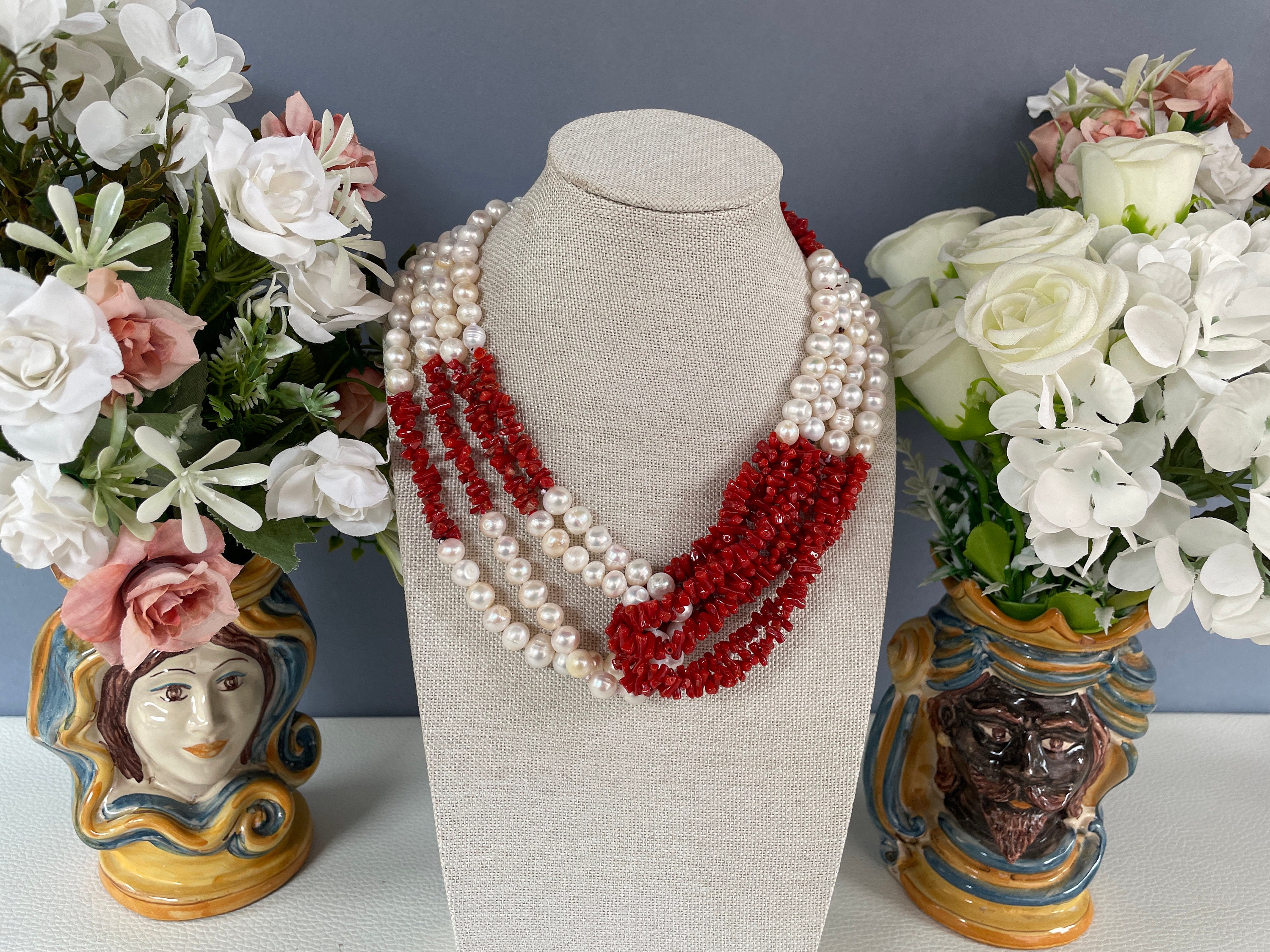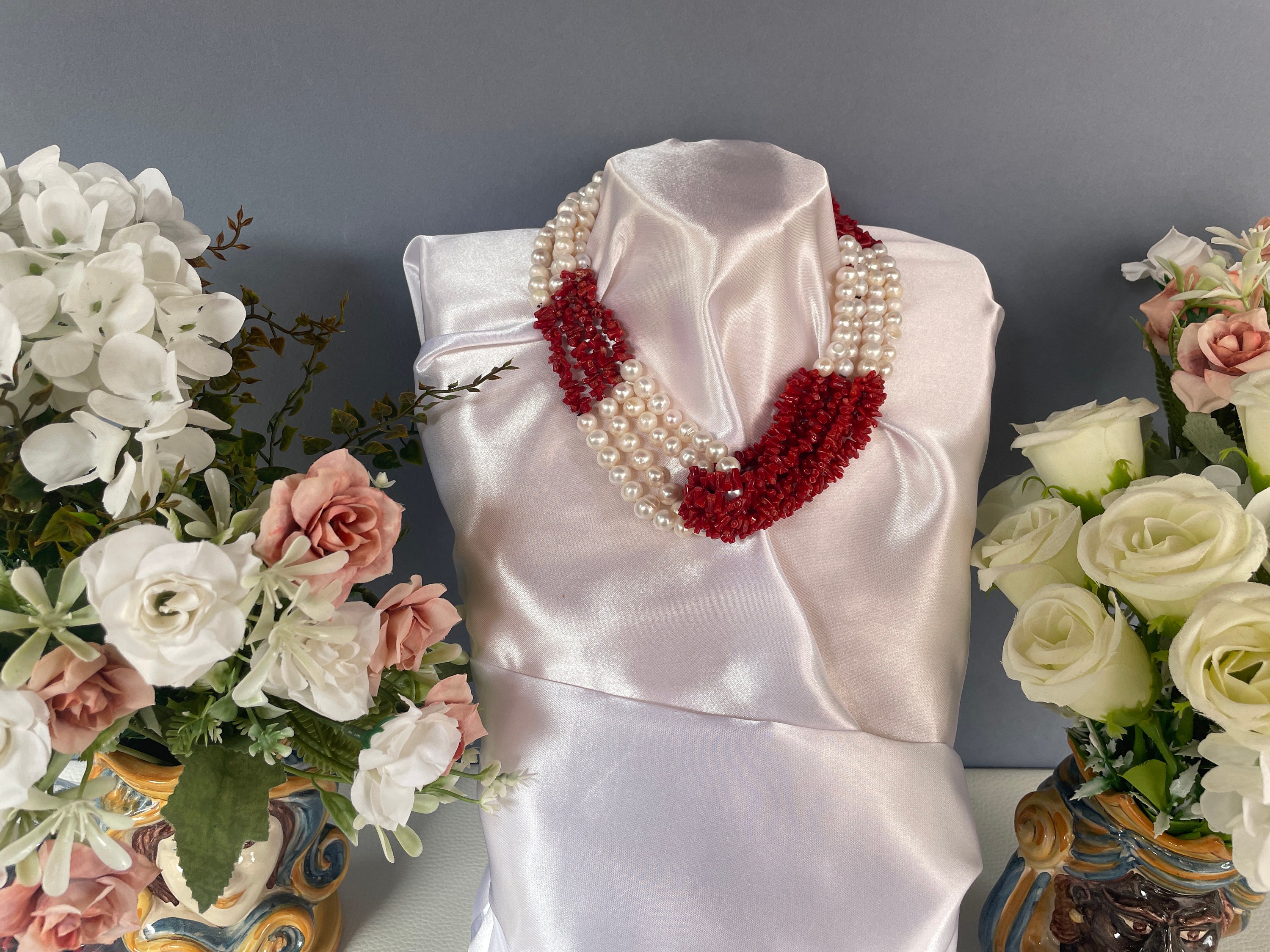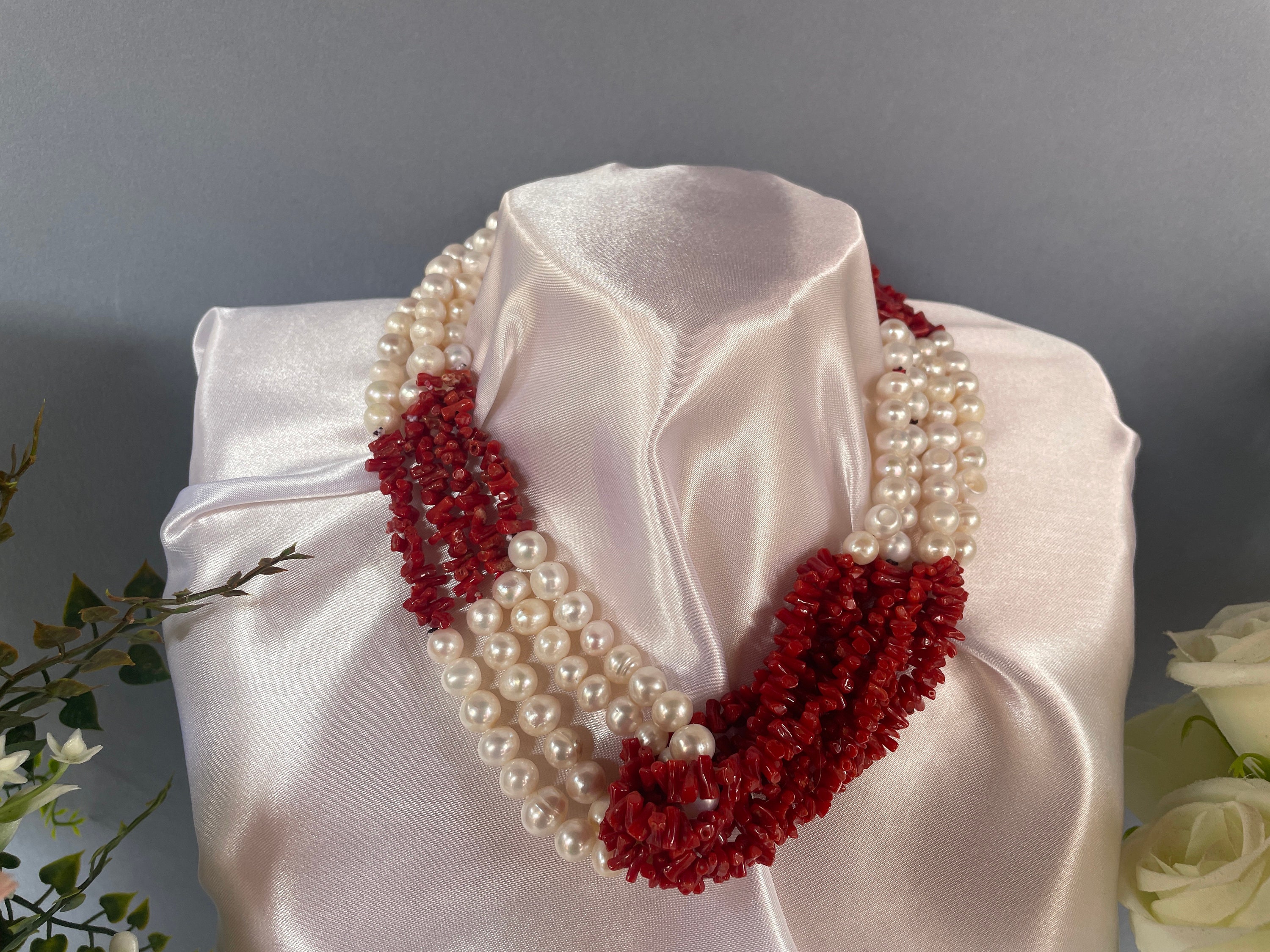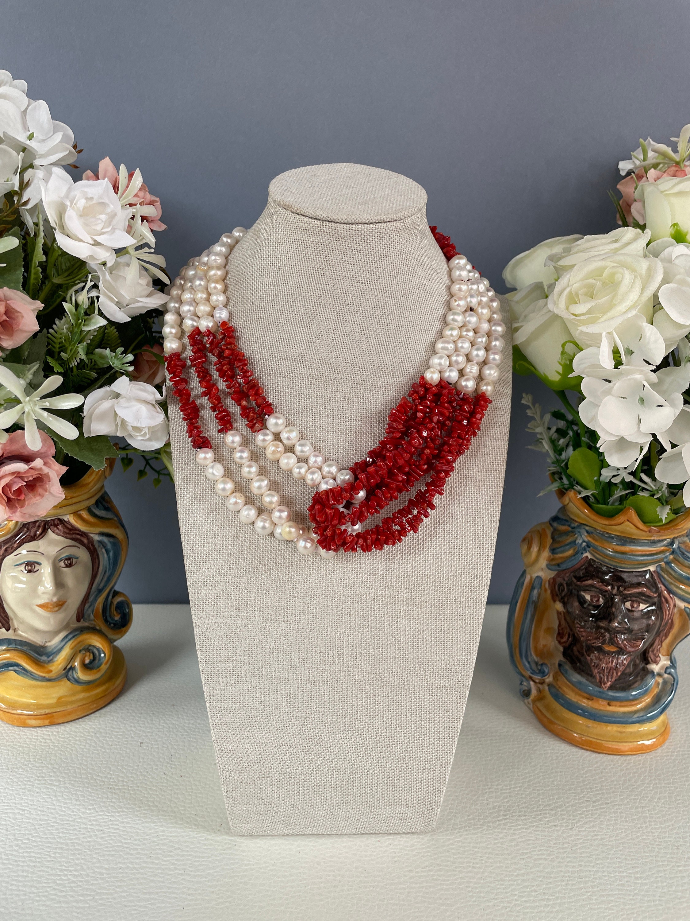 Realizzata con 4 fili di perle di fiume e 4 fili di chips di Corallo autentico del Mediterraneo che si abbracciano centralmente sul fronte.