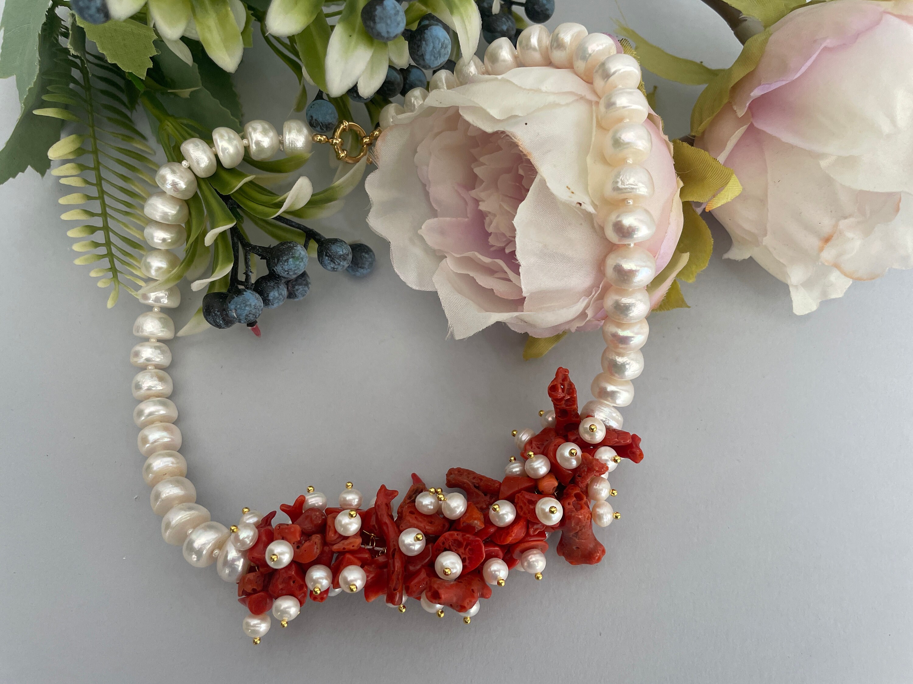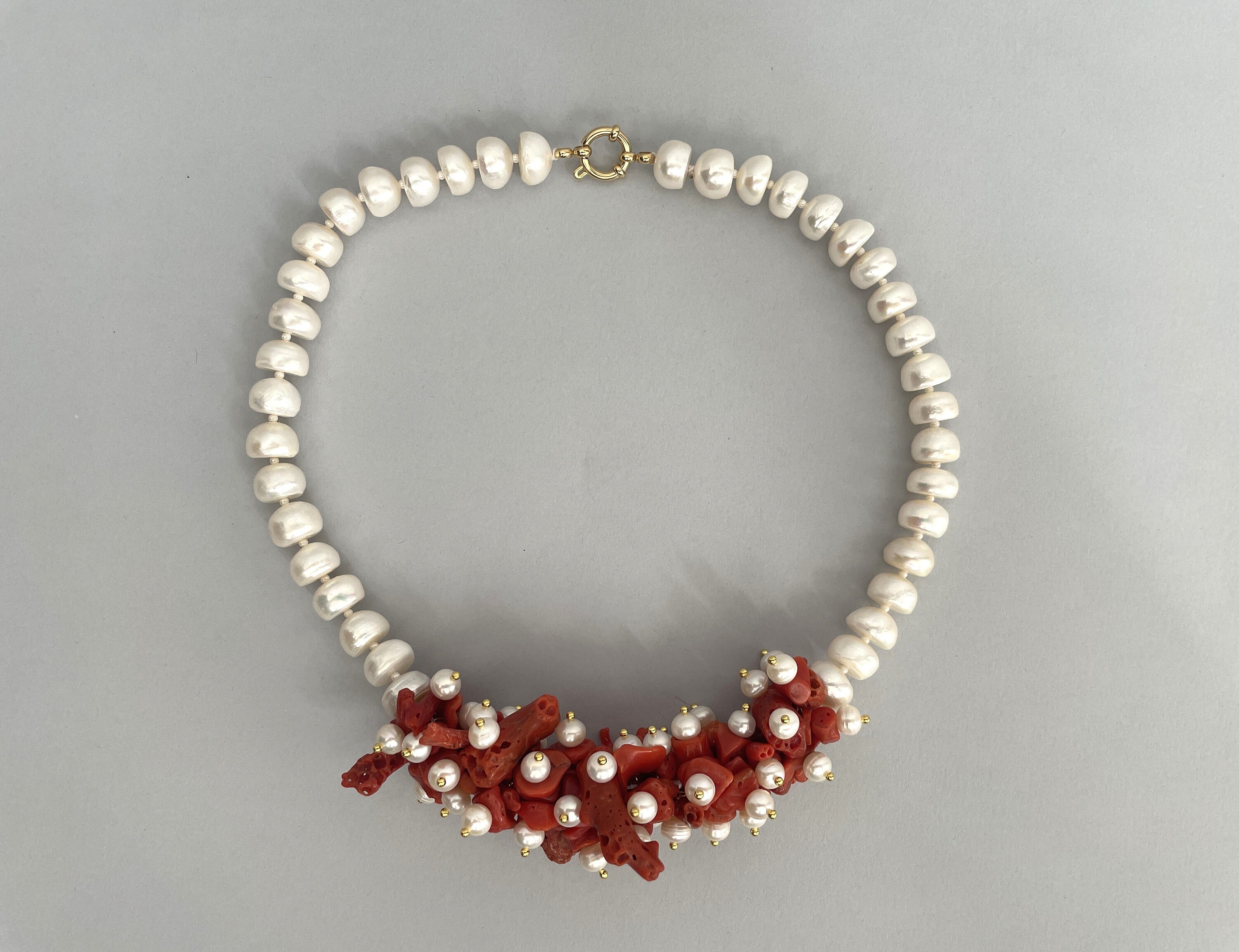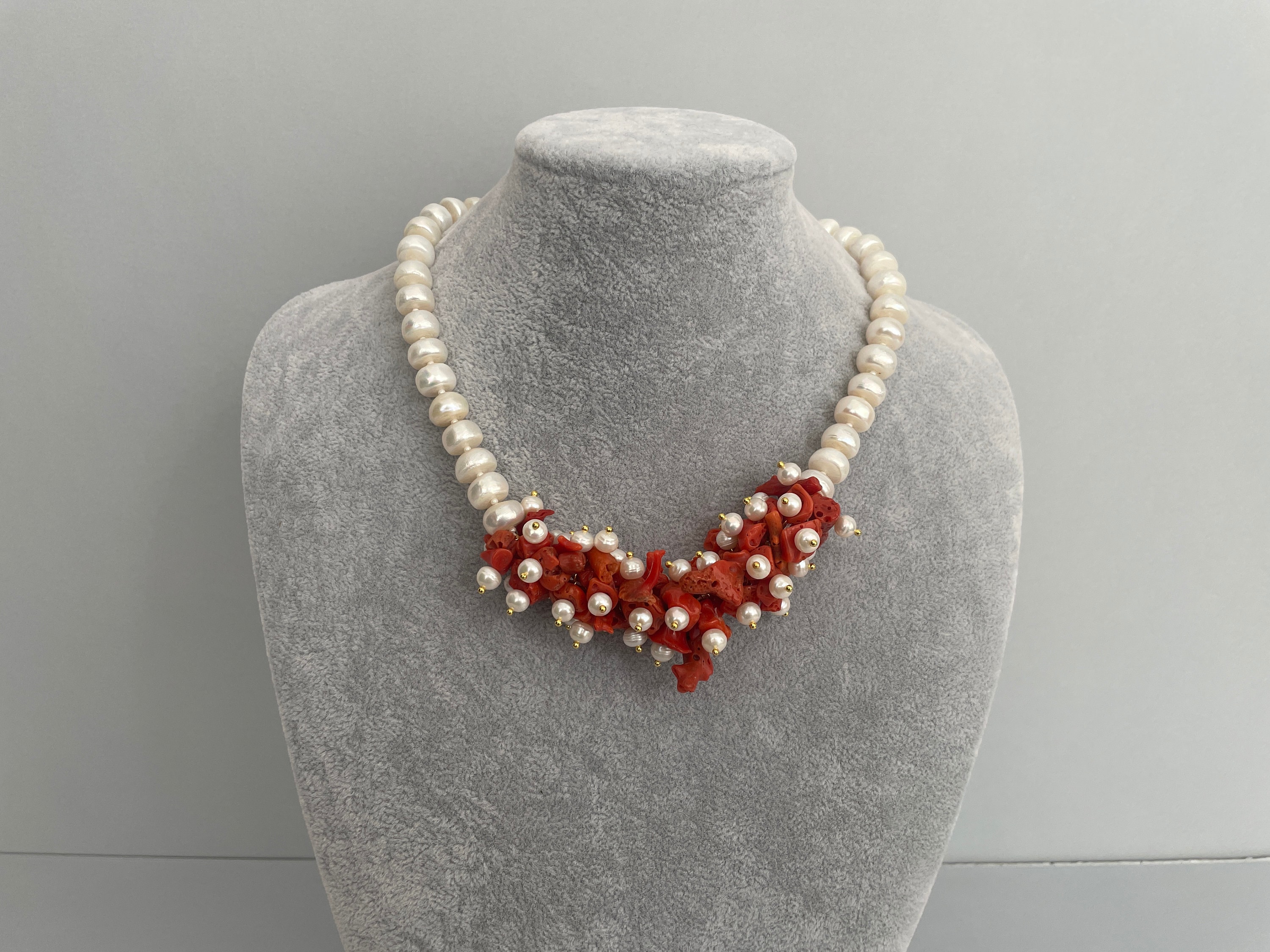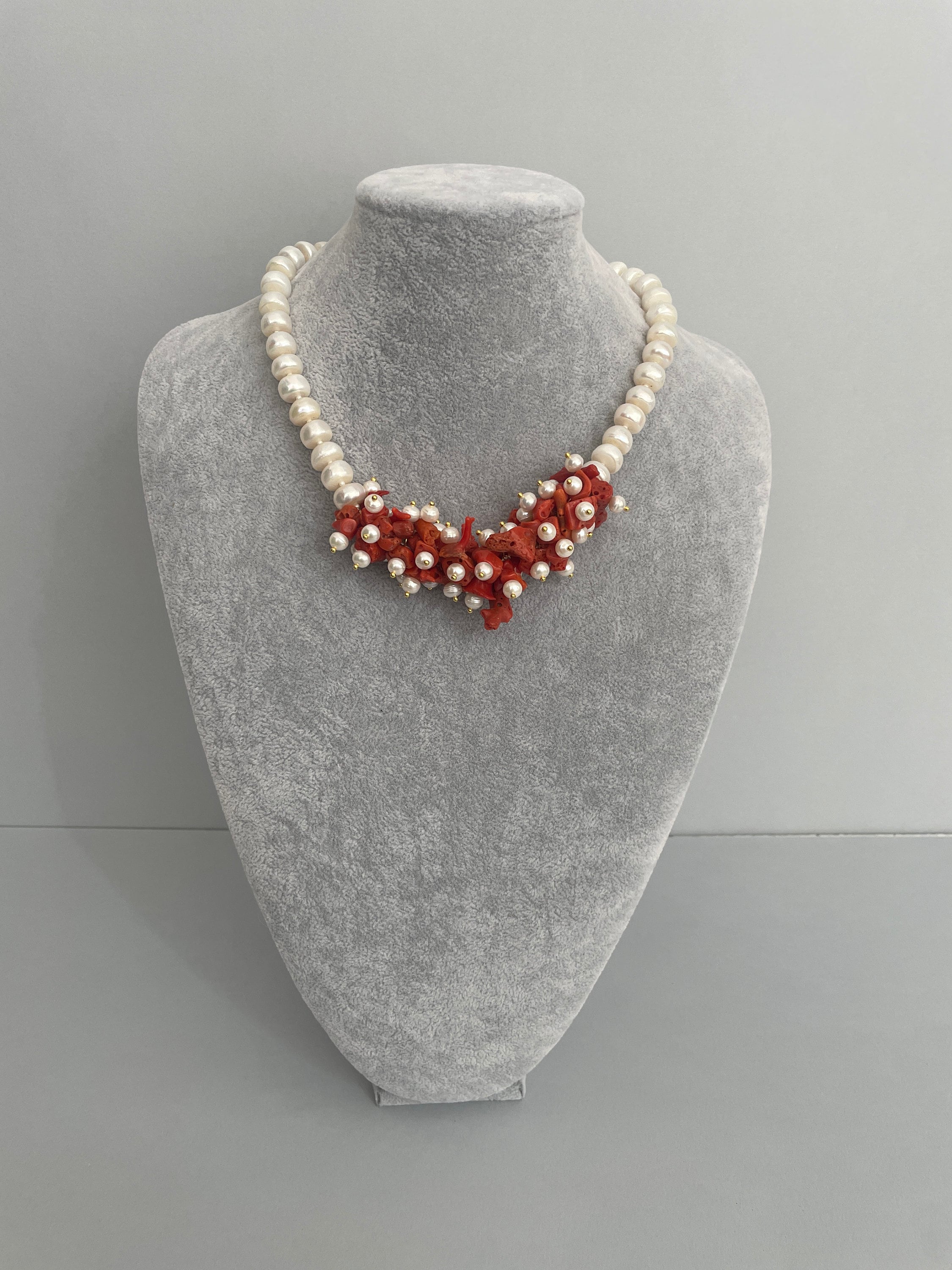 Realizzato con grandi perle barocche schiacciate e in posizione centrale una ghirlanda composta da pezzi di Corallo autentico del Mediterraneo e perle di fiume.