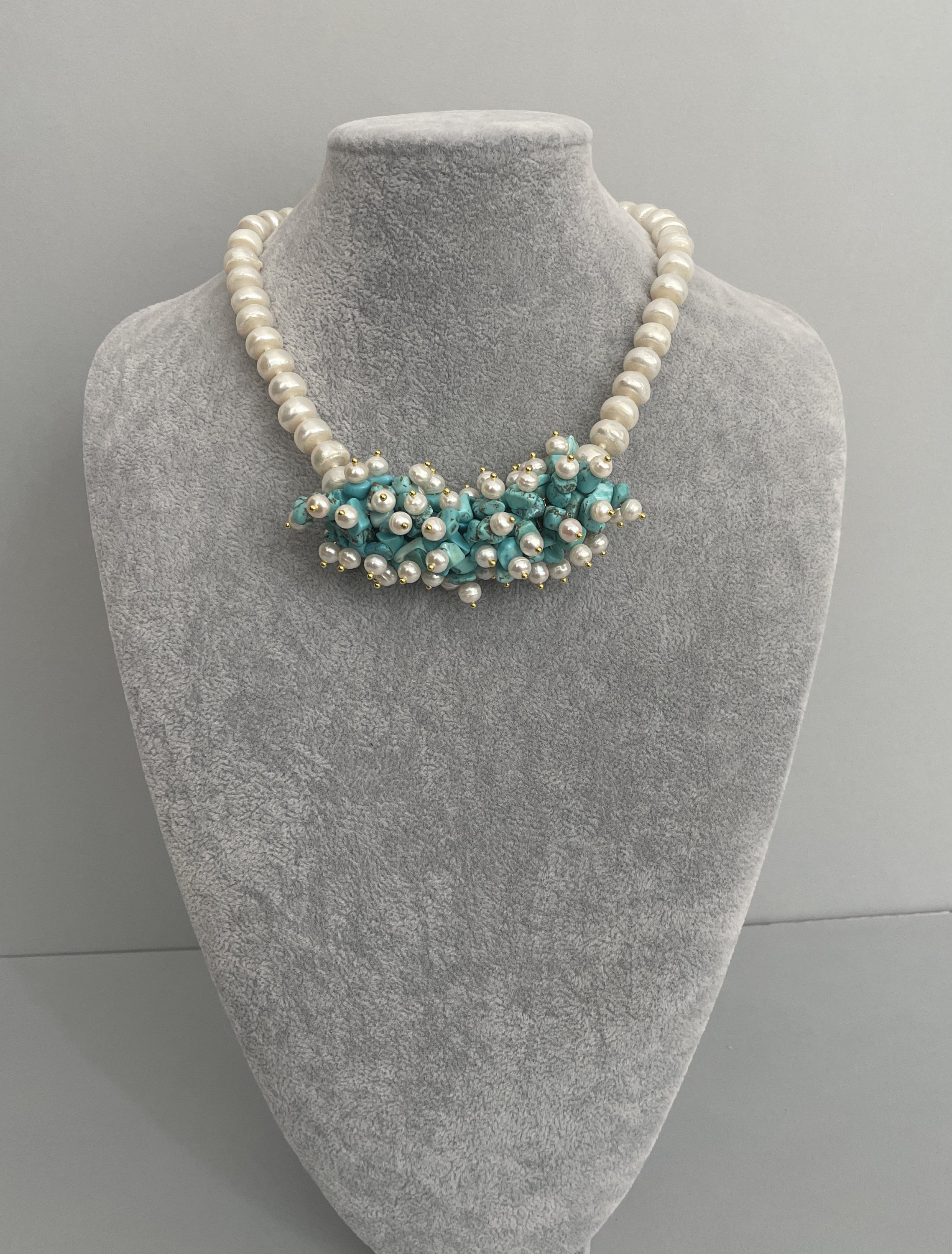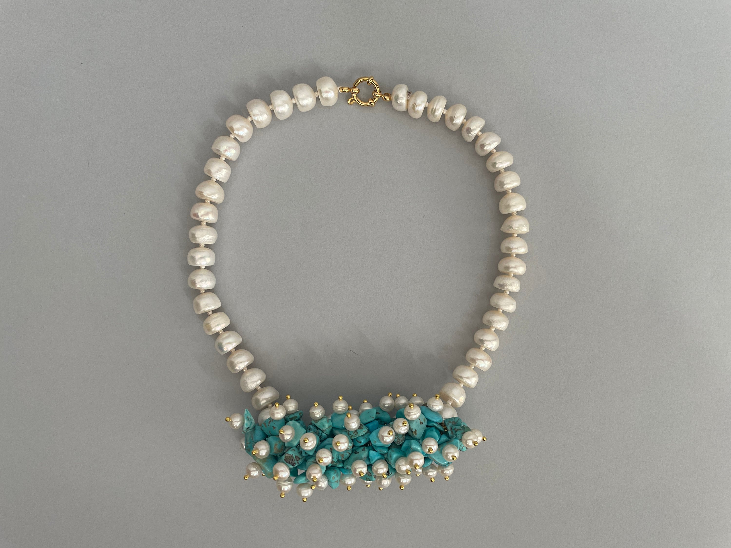 Realizzato con grandi perle barocche schiacciate e in posizione centrale una ghirlanda composta da chips di pasta di Turchese e perle di fiume.