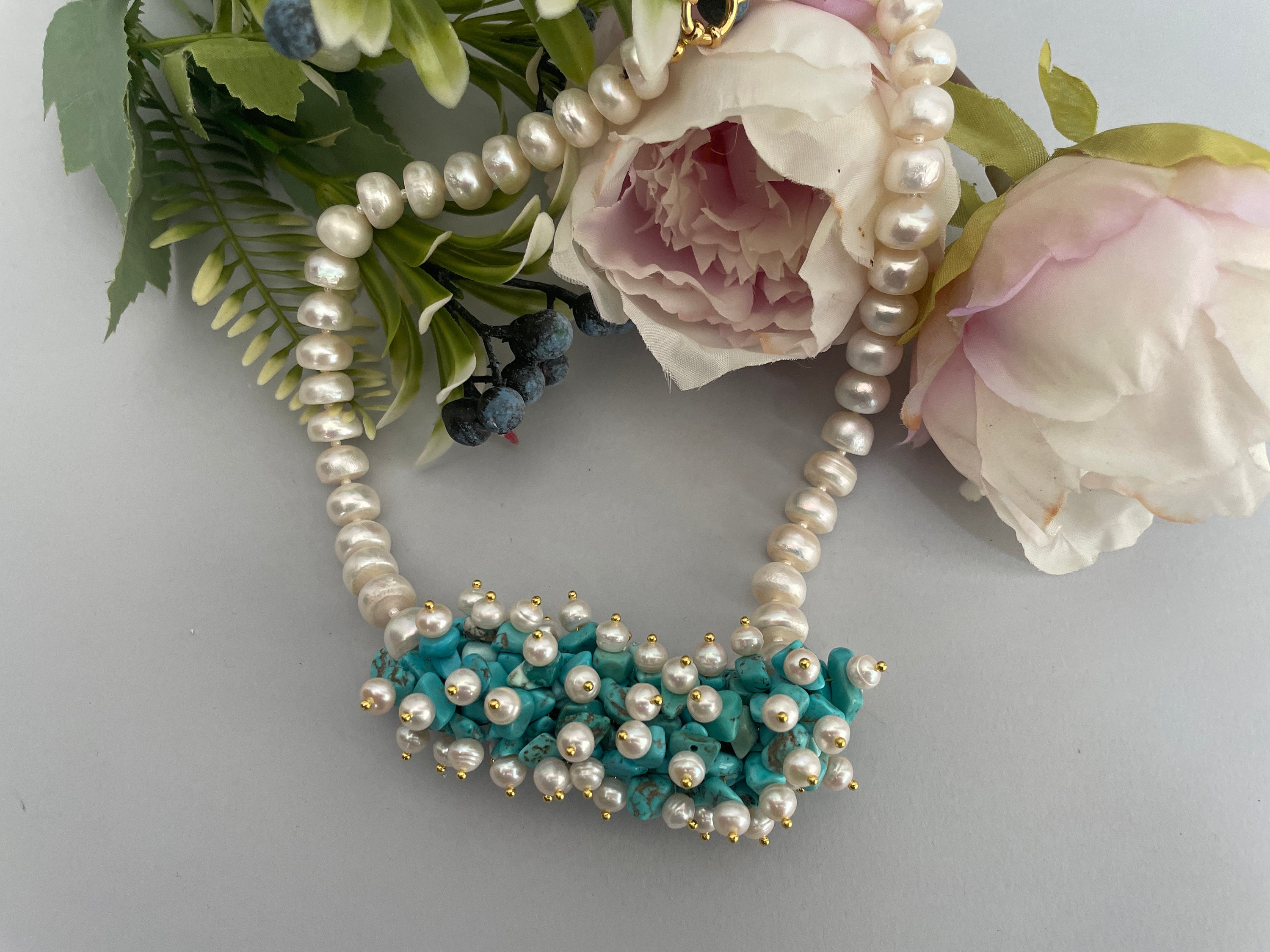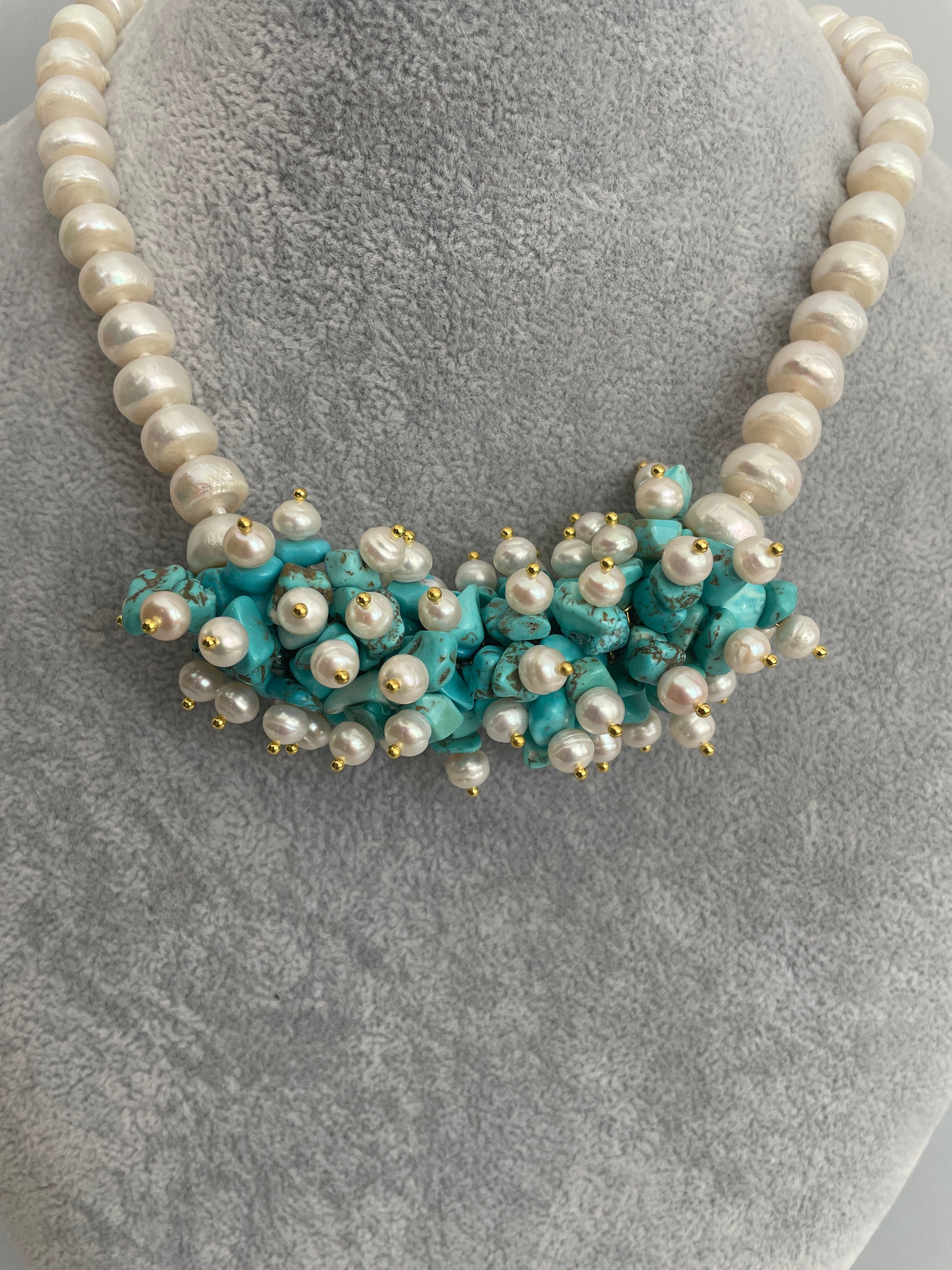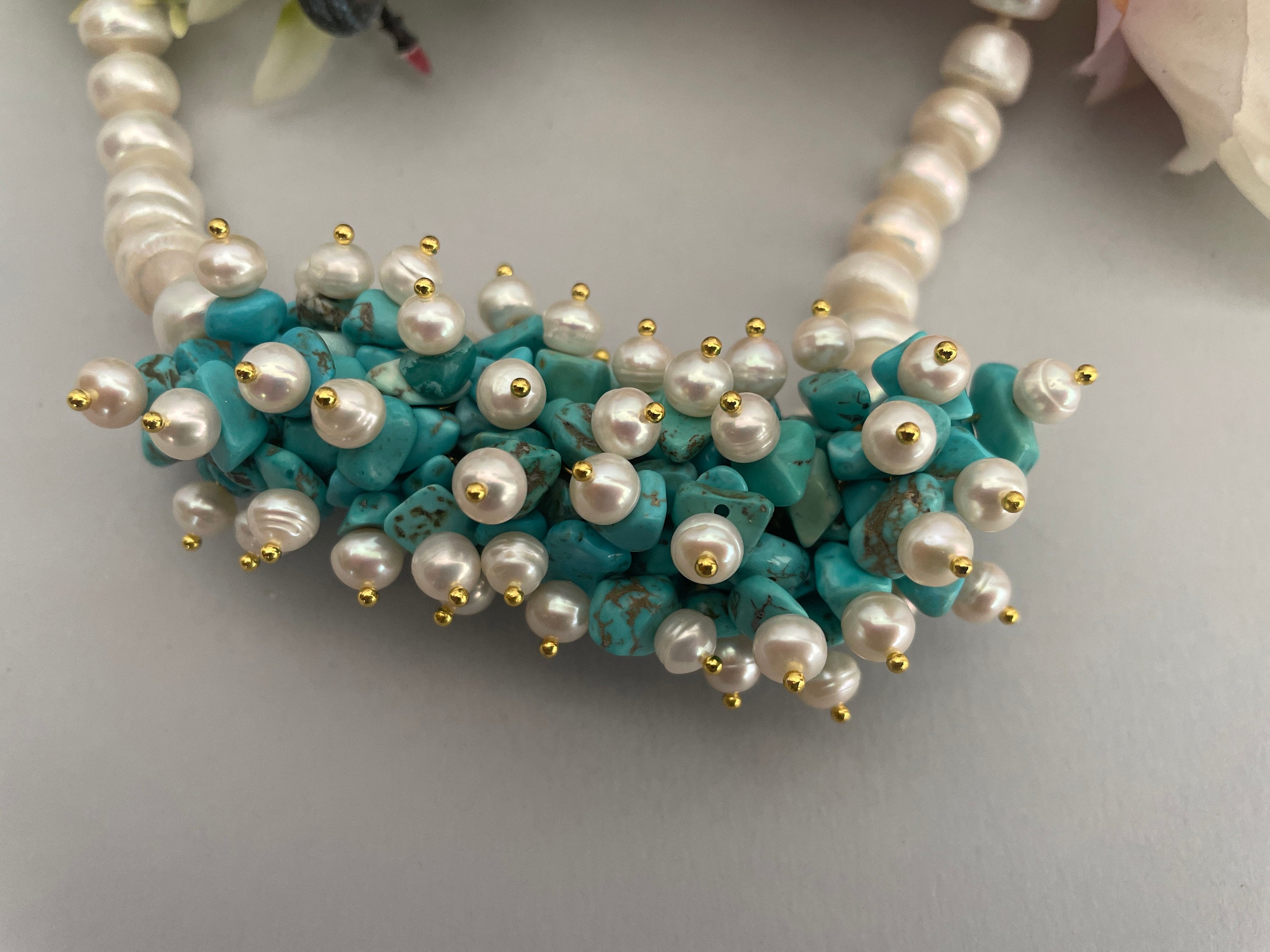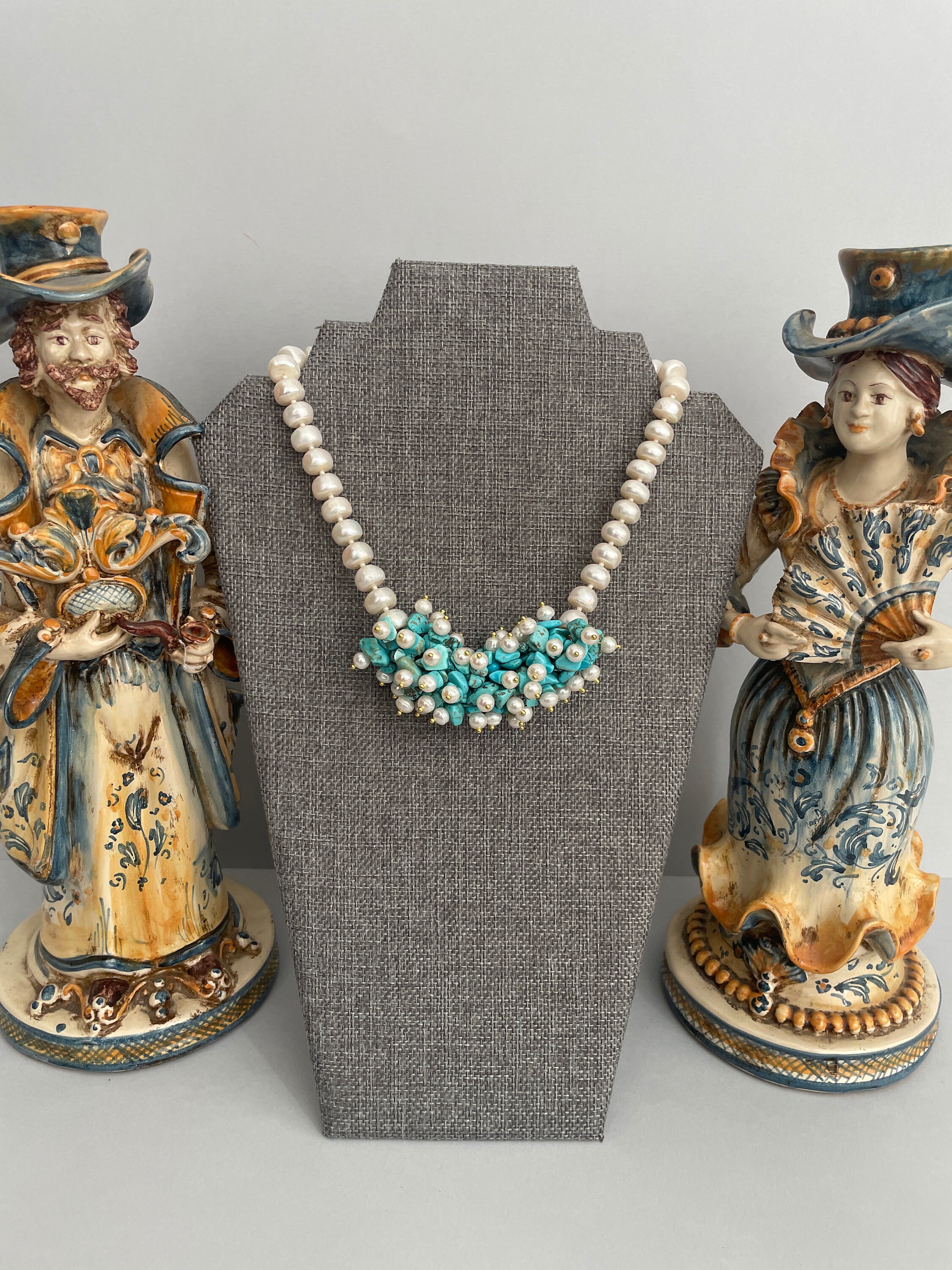 Splendido collier perle barocche, Trionfo di turchesi e perle, collana siciliana, pasta di turchese e perle naturali.